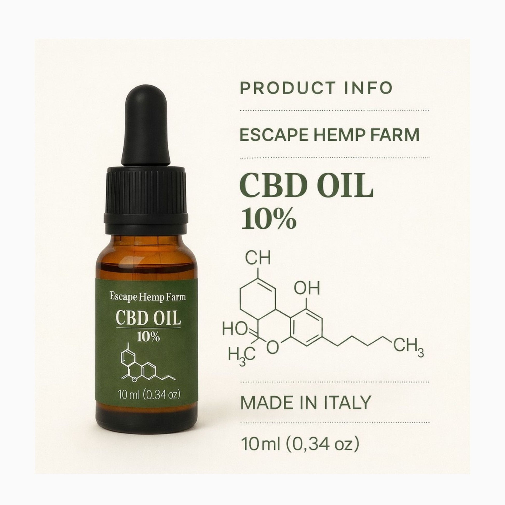 L’Olio CBD 10% MCT di Escape Hemp Farm nasce da canapa sativa certificata, coltivata in Italia all’interno della nostra filiera agricola controllata.