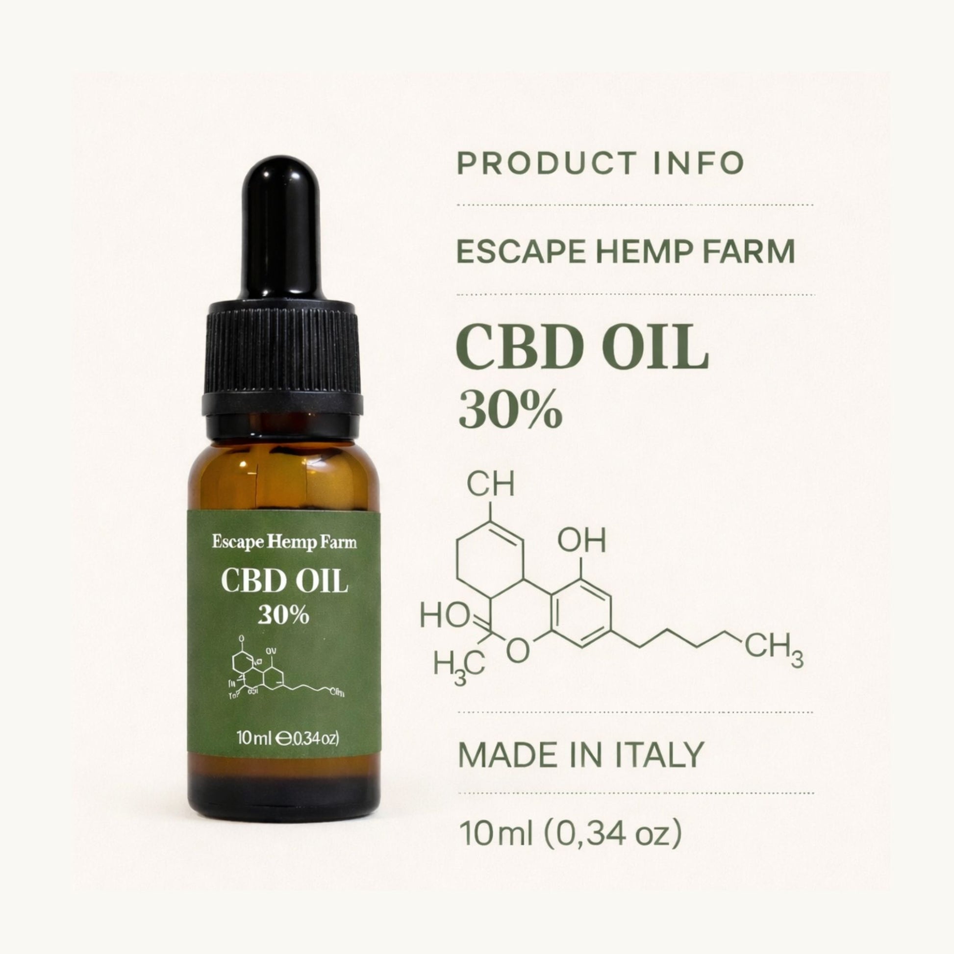 L’Olio CBD 30% MCT di Escape Hemp Farm nasce da canapa sativa certificata, coltivata in Italia all’interno della nostra filiera agricola controllata.
